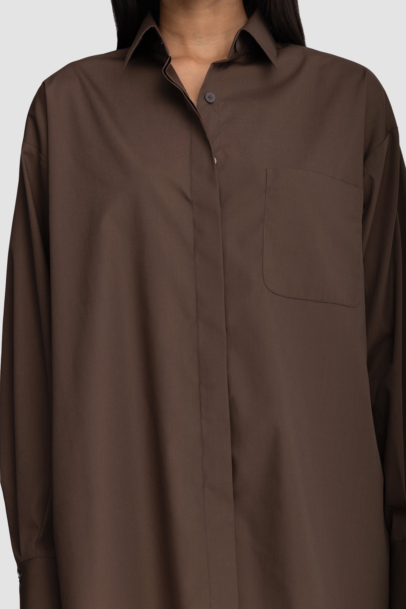 The Signature Shirt in brown is a wardrobe staple defined by classic proportions and thoughtful detailing. Cut with a clean, relaxed structure, it features a classic collar and long sleeves finished with double-button cuffs. A large breast pocket anchors the design at the front, adding a functional yet understated accent. Traditional button fastening runs down the front, while a subtle buttoned cinch at the back allows for gentle shaping of the silhouette. Timeless and versatile, the Signature Shirt is designed to pair effortlessly with tailored pieces or worn casually as a refined everyday staple.
