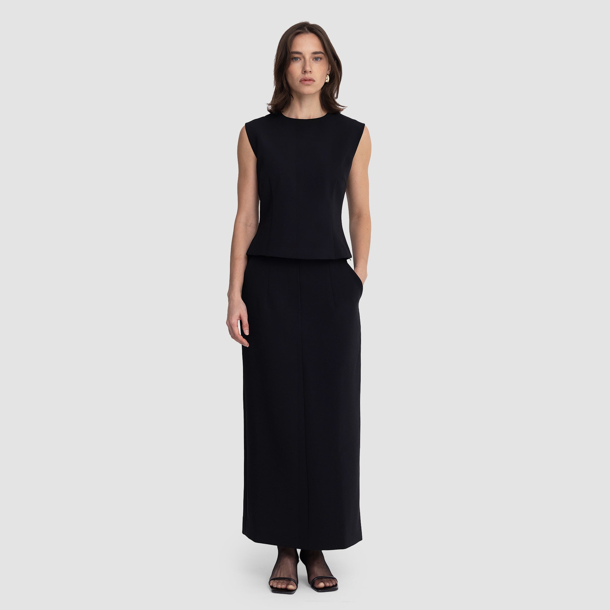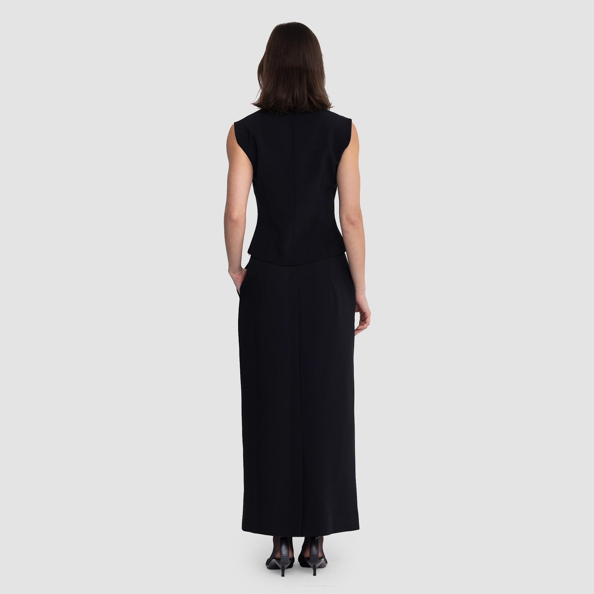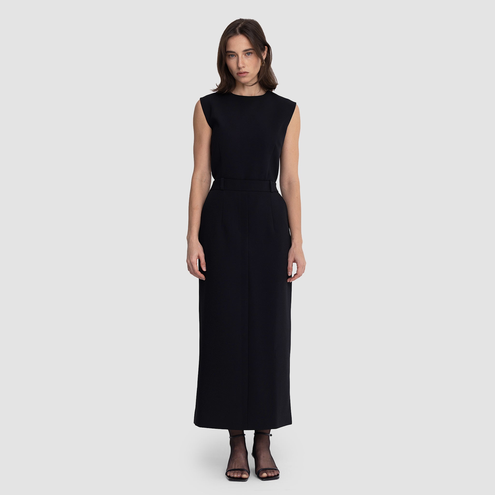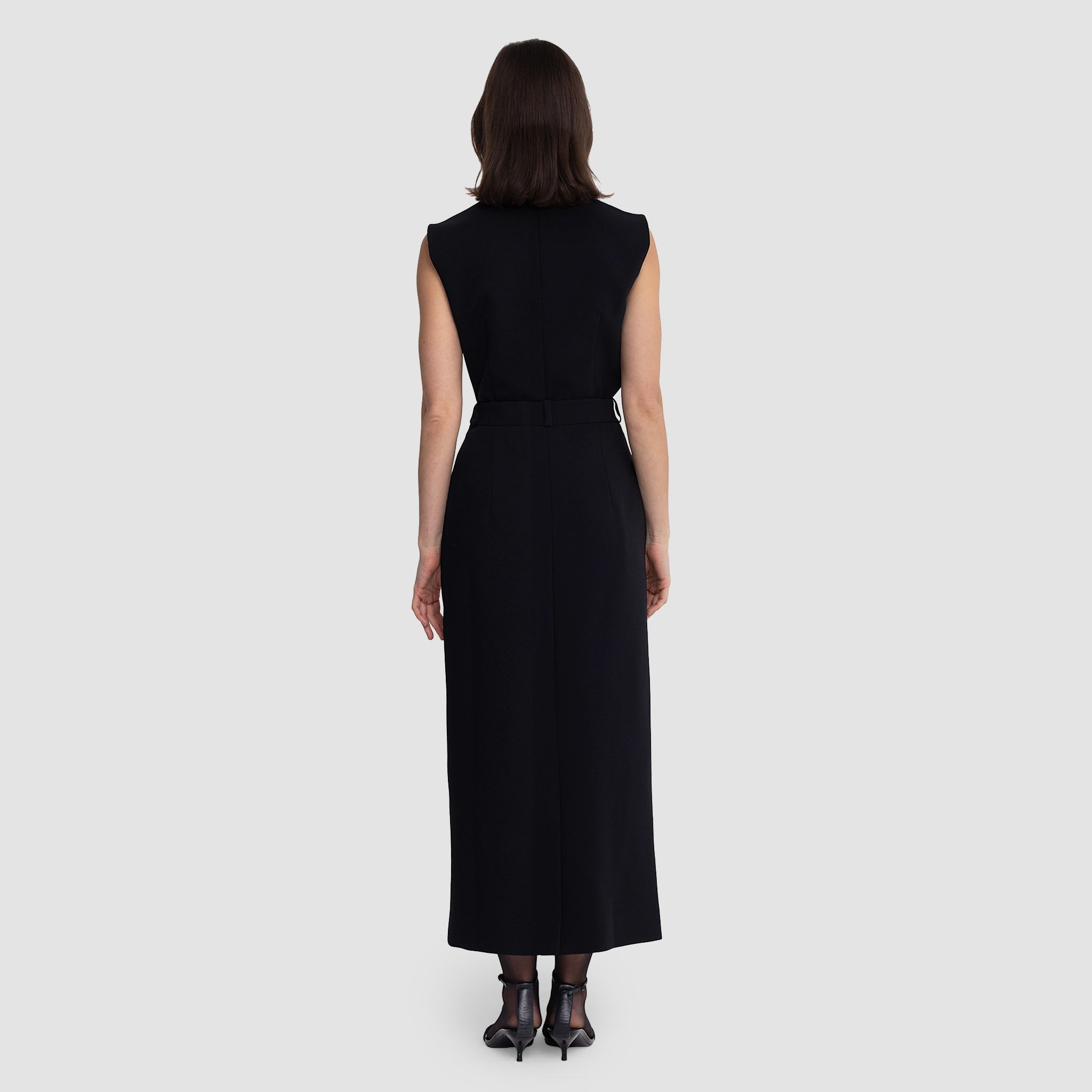 • Shoulders: Structured with sculptural cap-sleeve shaping